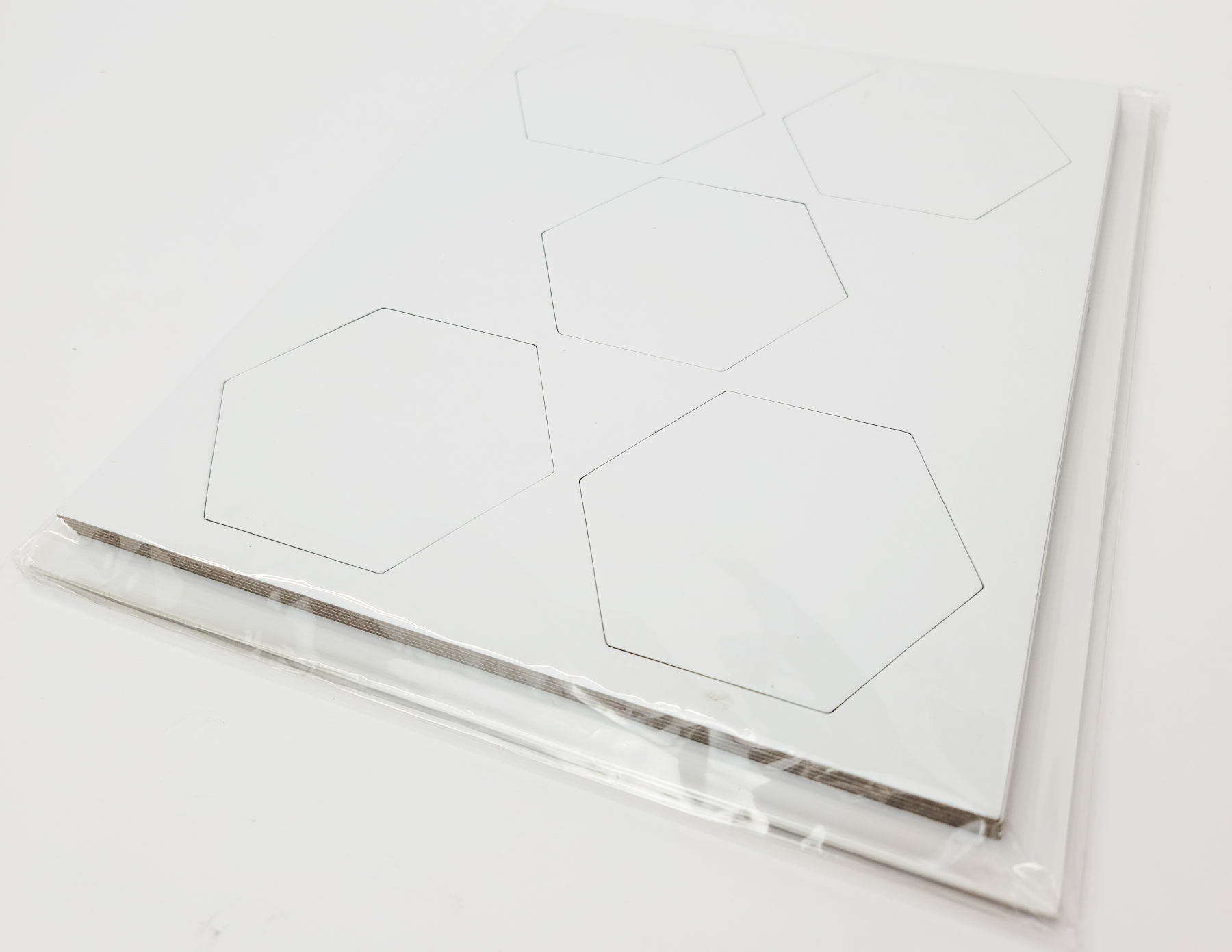 BlanksThese 25 chipboard hexagonal blanks plus 10 printable sheets of 5 each thermal die-cut hexagonal peel-and-stick shapes allow you to print out your Polyversal Combatant Tile Designs from Arsenal, peel, and adhere them to the blanks (double-sided). When you design a Combatant Tile for Polyversal, you can easily print that design out on this paper, peel it off, and stick it to a blank for a great looking gamepiece that matches the feel and size of the production game pieces. Focus less on arts and crafts and more on design. The Hex paper exactly matches the Arsenal Tile Sheets output. Intended for Ink Jet printers.