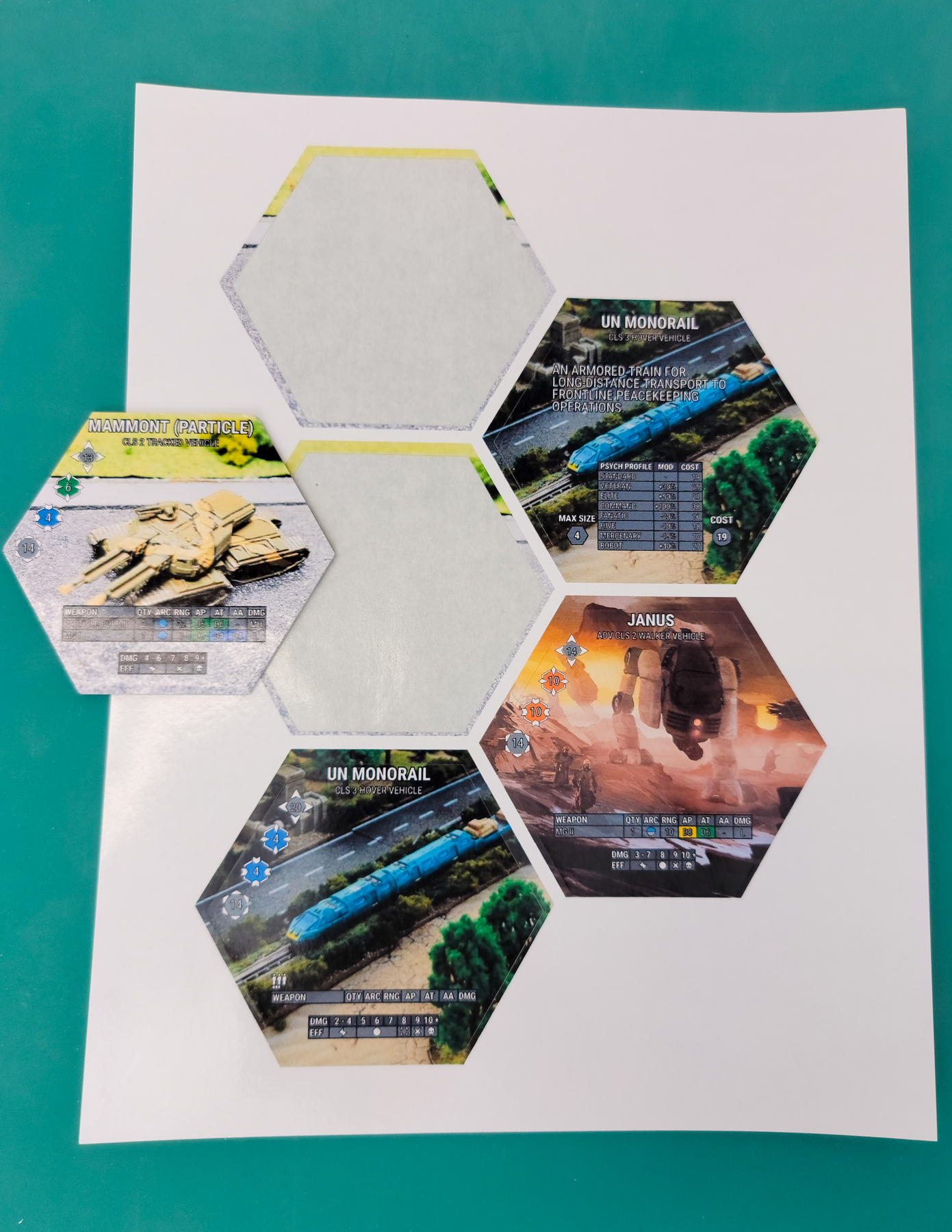 • 10x sheets of inkjet-compatible 8.5"x11" (photo glossy paper) with 5 thermal die-cut hexagons per sheet (50 total hexes for 25 double-sided Combatant Tiles)
